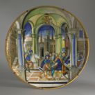 talerz majolikowy z dekoracją istoriato - Uratowanie Rzymu przez Kamillusa i herbem Paleolog-Montferrat